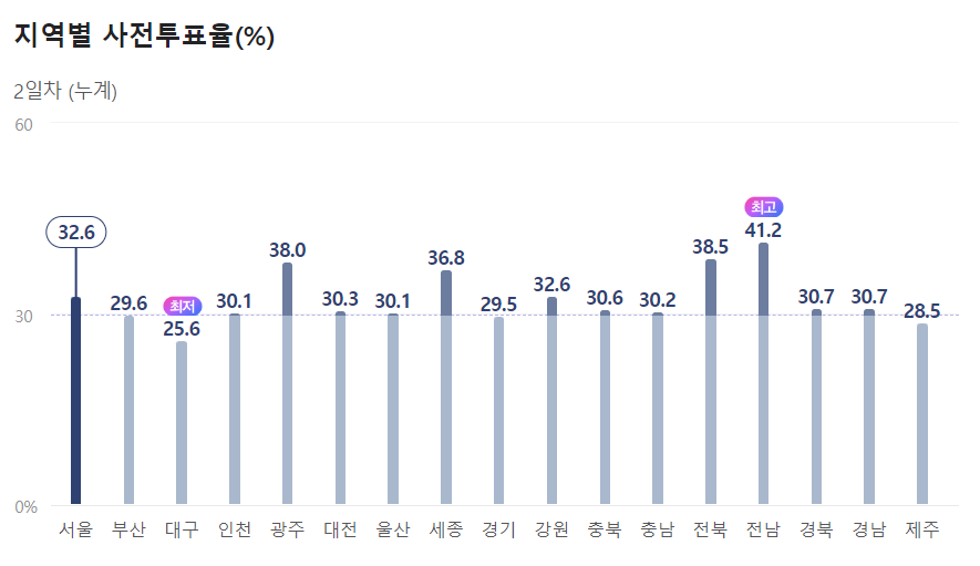 지역별로 보면 투표율이 가장 높은 지역은 전남, 전북, 광주, 세종 순이고 가장 낮은 곳은 대구, 제주, 경기, 부산순입니다. 서울은 32.6%네요.